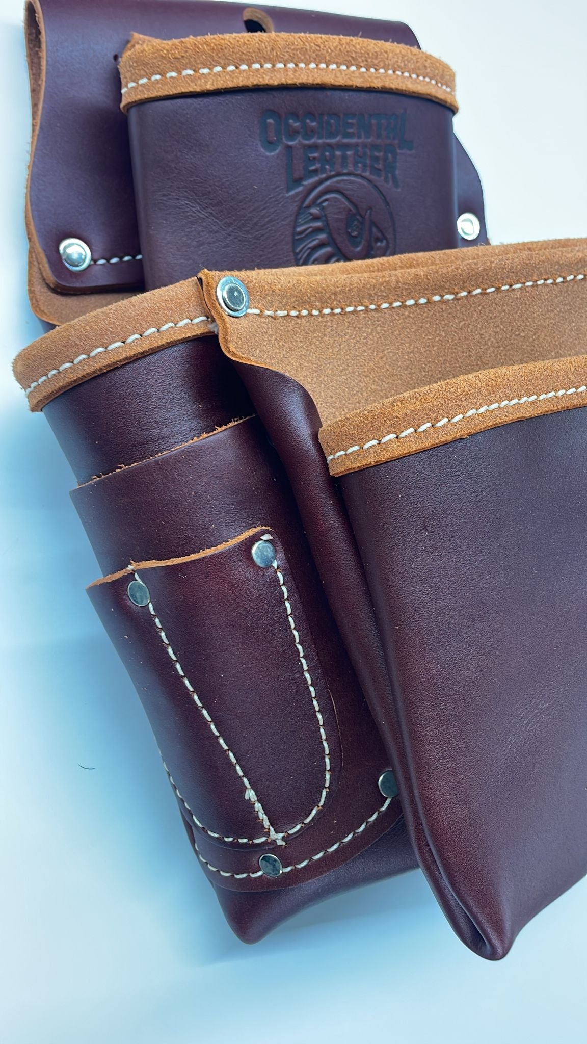 The most popular leather fastener bag. Highly recommended for framing and general carpentry applications. Holders for 1” blade square, angle square, cat’s paw loop, driver bits, etc.